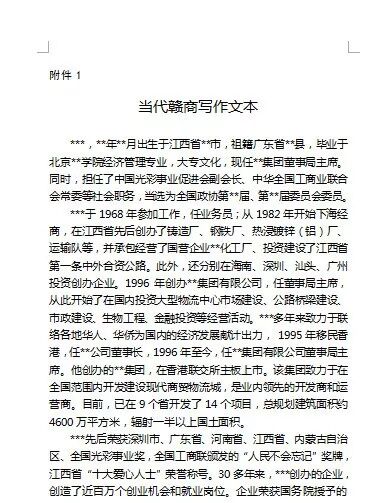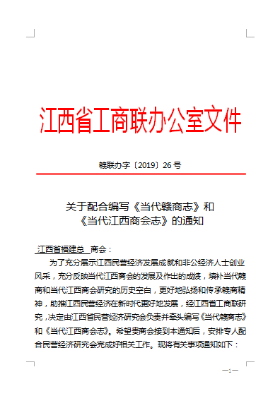 近日,我会接到江西省工商联办公室〔2019〕26号文,望我会按照相关要求推荐入《当代赣商志》的赣商名单,现将具体通知附告如下,望符合条件的赣商于今年8月底之前将材料报于我会秘书处,请各会员互相告知,以免遗漏。