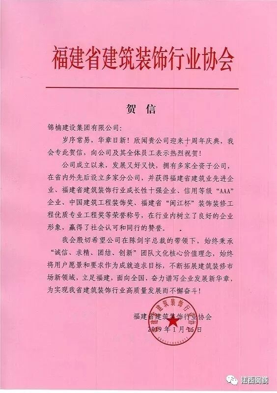 2019年1月17日,集团年庆暨“锦楠建设”成立十周年盛典晚会在福州香格里拉五星级大酒店隆重举行。本次盛典以“锦楠筑造,创新伟业”为主题,寓意锦楠集团所肩负的责任和使命,锦楠人将携手战略合作伙伴一起开启新的征程,续写新的华章。