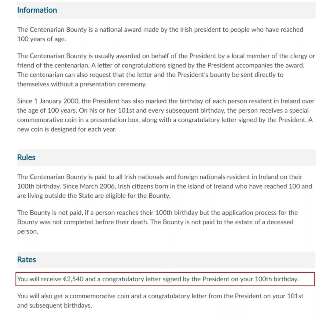 在爱尔兰居住的百岁老人在过生日时会得到一笔2540欧元的奖金,爱尔兰总统也会亲笔签署一封祝贺函。