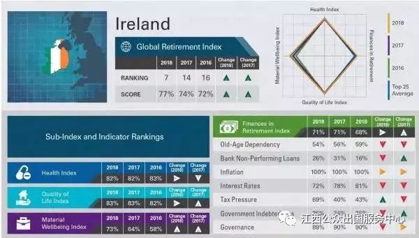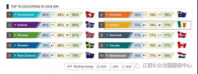 在此排名中,爱尔兰名次呈现着逐年上升的趋势,并凭借77%的得分排名世界第7,总排名同比去年进步了7名!