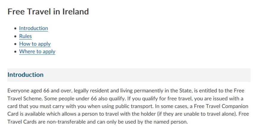 在爱尔兰合法永久居住的66岁以上老人可申领境内交通卡,免费乘坐爱尔兰境内的公共交通,包括:公交、火车、轻轨。