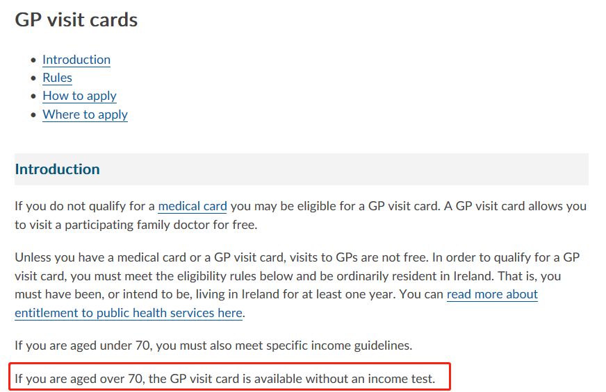 爱尔兰政府为70岁以上的老人免费发放GP医疗访问卡,老人们享受免费的医疗服务,此卡的发放不受收入限制。