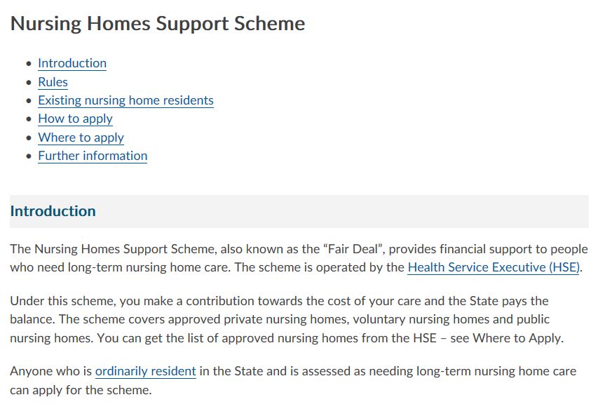 爱尔兰政府为需要入住养老院的老人提供国家补贴 Fair Deal,资助其入住养老院(公立和私立均可),每个床位每周1,000欧左右。