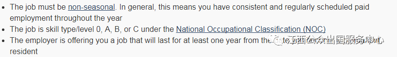 ◆当前为阿省雇主从事全职工作,职业类别为NOC 0, A or B,如果是C类职业需要满足语言要求,有些职业不能申请;C类职业清单 ;