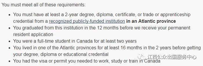 1. 在加拿大海洋四省认可的公立教育机构完成两年全日制高等教育并获得证书、文凭、学位等。